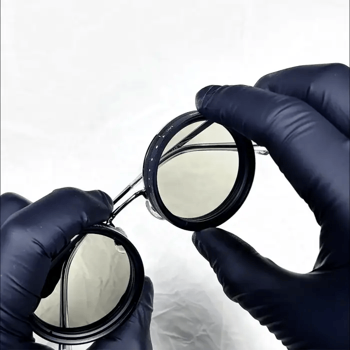Nos lunettes sont équipées d’un système de molette discret situé sur la monture. En la tournant simplement, vous ajustez l’obscurcissement des verres selon la luminosité. Cela vous permet de passer d’une teinte légère à une teinte plus foncée en quelques secondes, sans aucun outil supplémentaire.